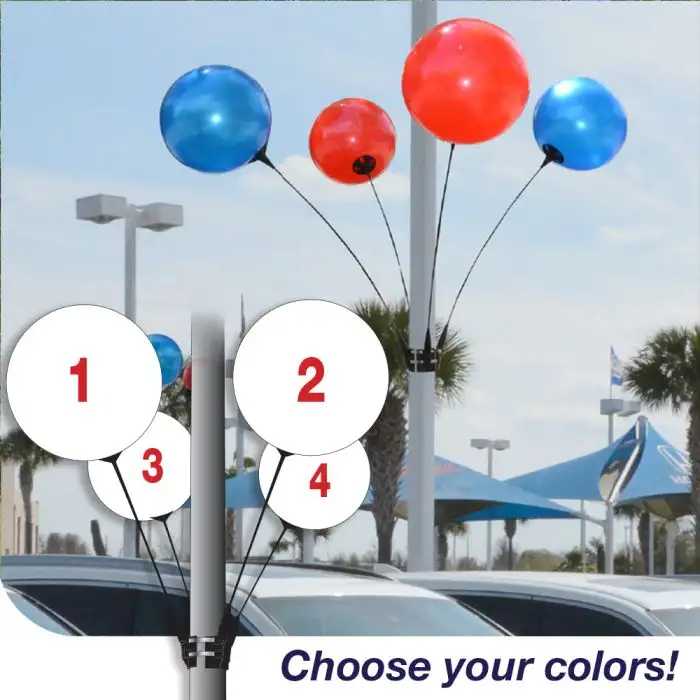 Create an eye-catching look by lining your lot with four-balloon light poles! Choose any four solid color vinyl balloons and be seen from any angle. These balloons tower over the ground to make your lot stand out! Plus, a great option if theft is common in your area (the height makes them harder to reach).